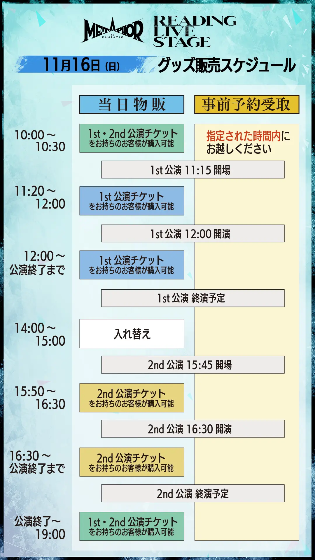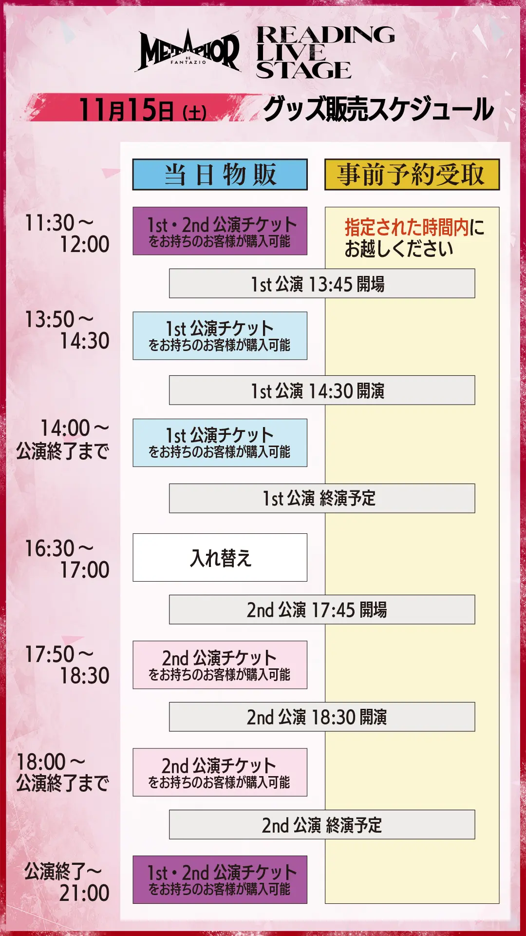- ・本公演のチケットをお持ちの方のみ、会場にてグッズをご購入いただけます。公演チケット毎に販売対象となる時間が異なりますので、事前にご確認くださいますようお願いいたします。
